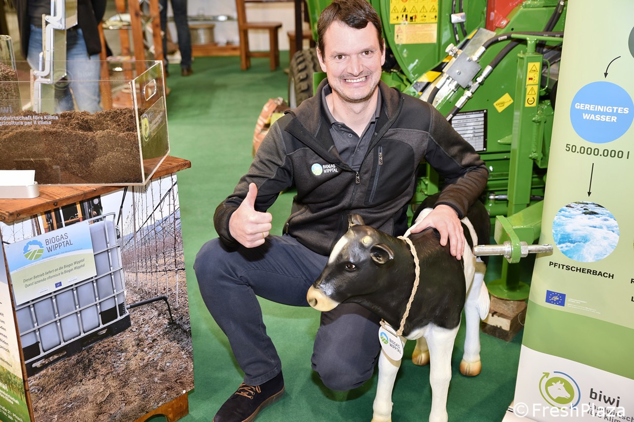 Manfred Gius della Biwi, azienda specializzata nella produzione di concime organico inodore, insieme alla mascotte dello stand!
