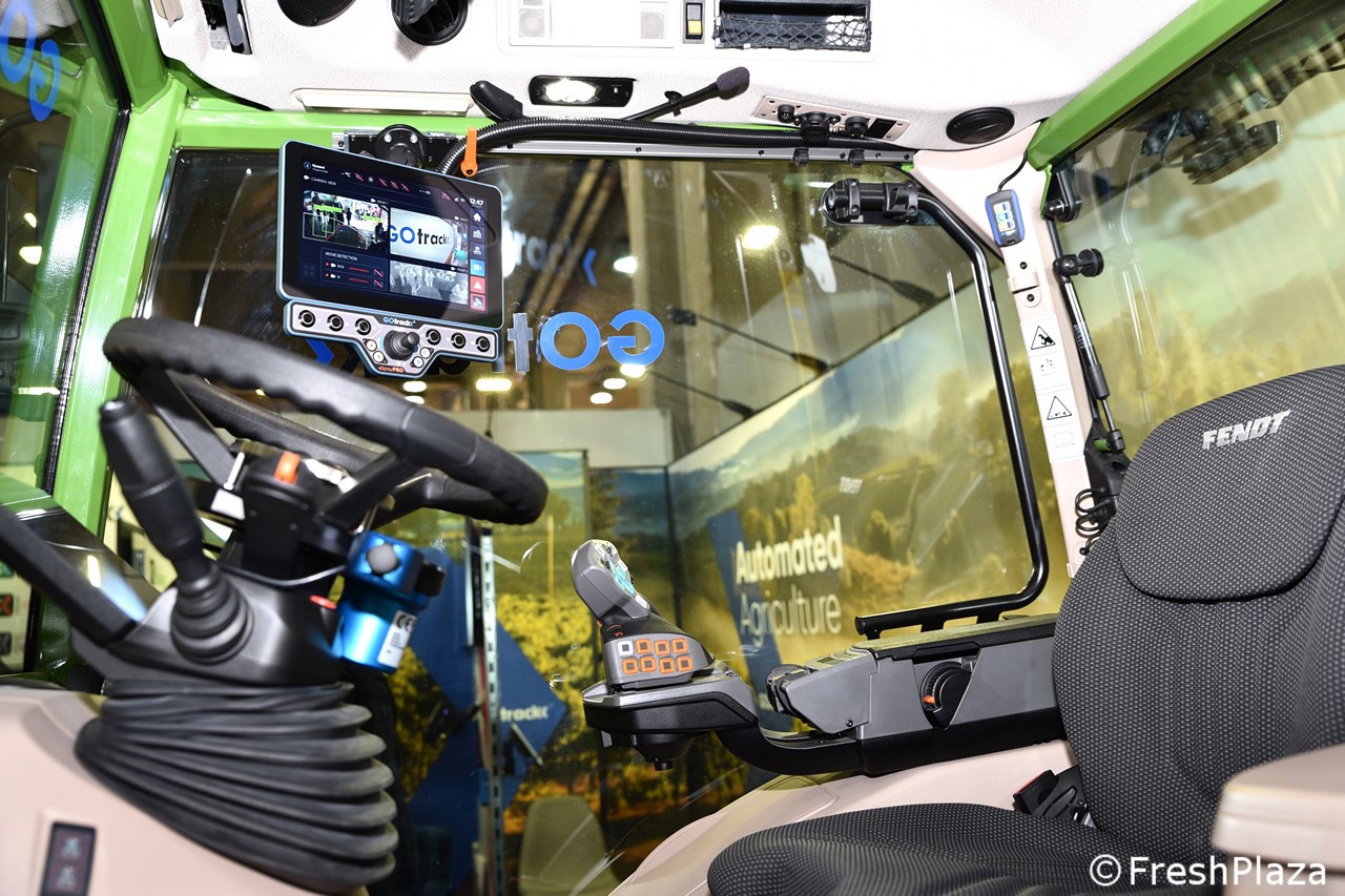 Dettaglio ravvicinato della cabina di "pilotaggio" del trattore a guida autonoma: dopo aver registrato il percorso da seguire con un guidatore umano, poi il trattore è in grado di replicare l'itinerario senza nessuno a bordo, evitando ogni ostacolo.
