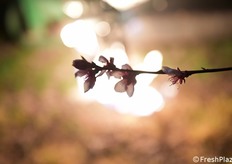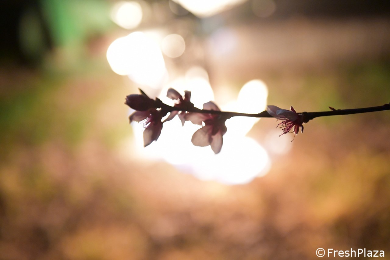 Particolare di un fiore di pesco in contrasto con la fiamma libera
