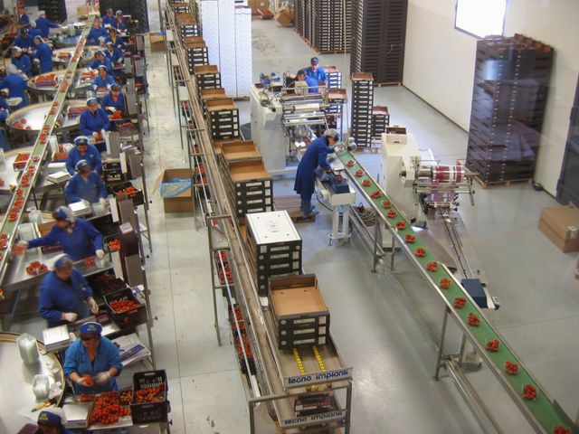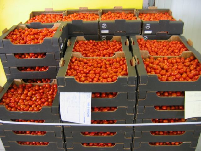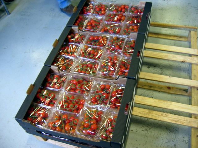 La linea di confezionamento dell'azienda lavora alacremente per consegnare 28 pallets di pomodorini al giorno.