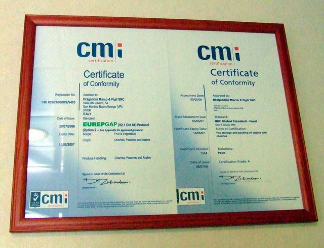 Alcuni dei certificati ottenuti dall'azienda Bragantini, in bella mostra sulla parete subito all'ingresso degli impianti.