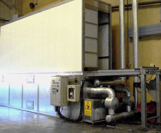 Questo macchinario è l'Hydrocooler, che serve per abbassare subito la temperatura delle ciliegie e portarla a 4 gradi centigradi. Le cassette in arrivo vengono inserite nell'enorme macchinario, dove sostano per almeno mezz'ora sotto una doccia di acqua gelata (a zero gradi). Mediante questo trattamento, si prolunga la shelf-life del prodotto e il picciolo della ciliegia si mantiene verde.