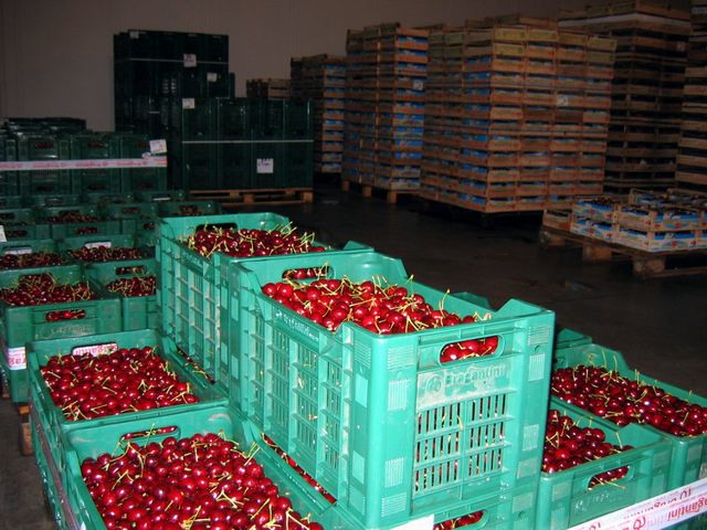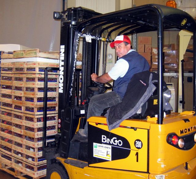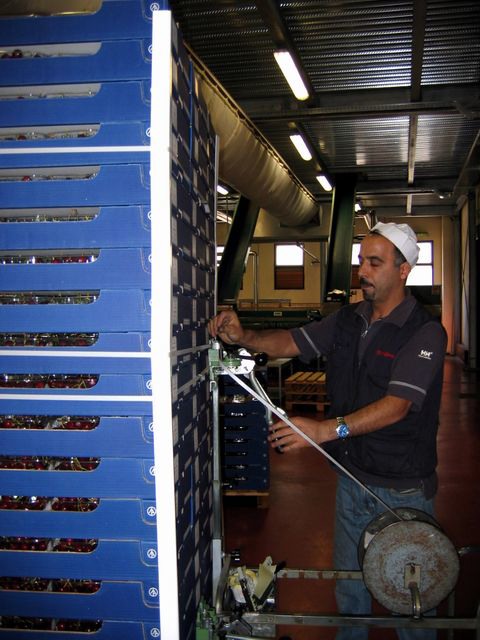 L'addetto al carrello - il brasiliano Marcos Da Silva - preleva le casse di ciliegie per trasferirle alla sala di confezionamento.