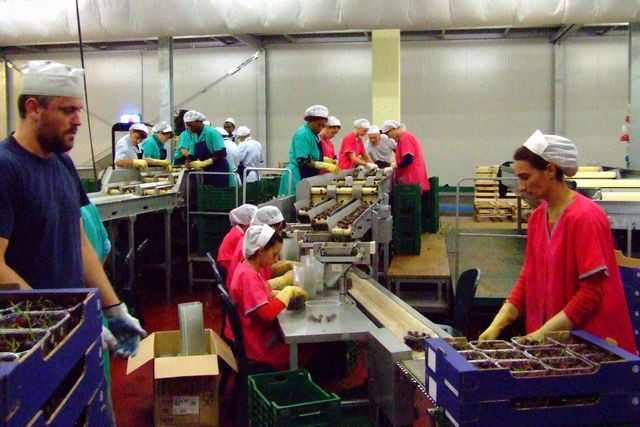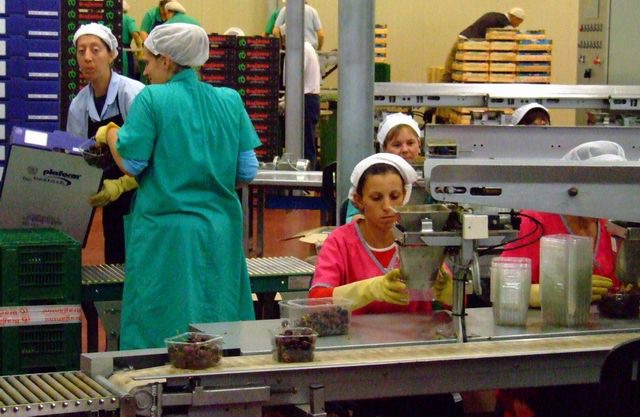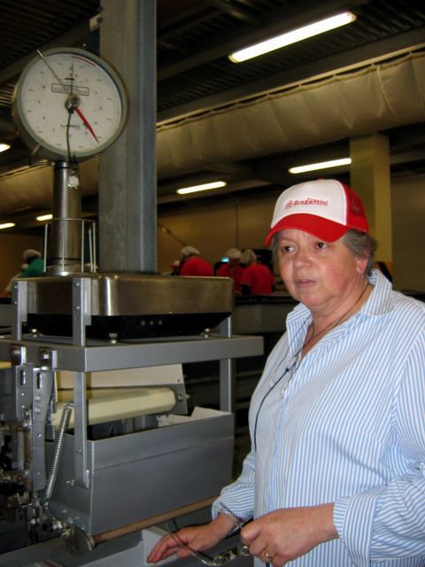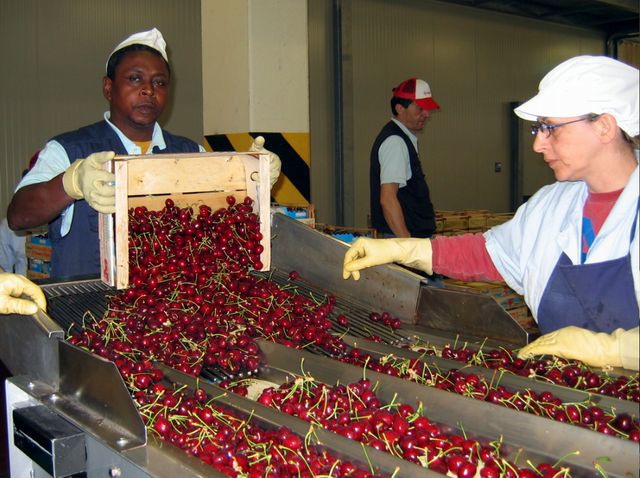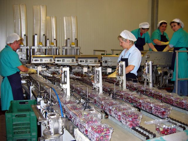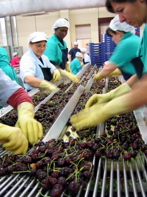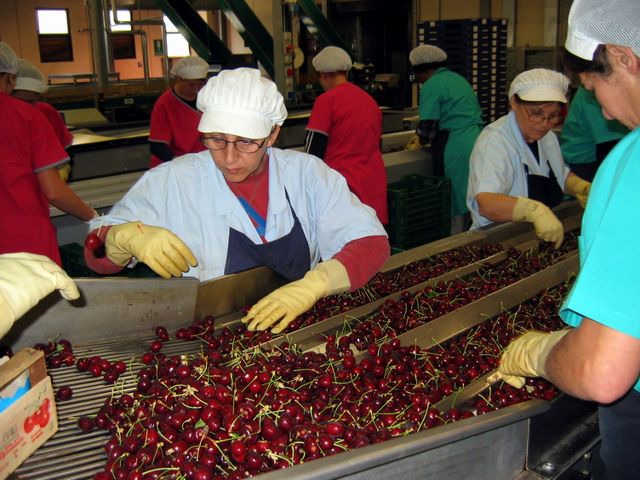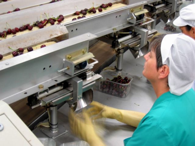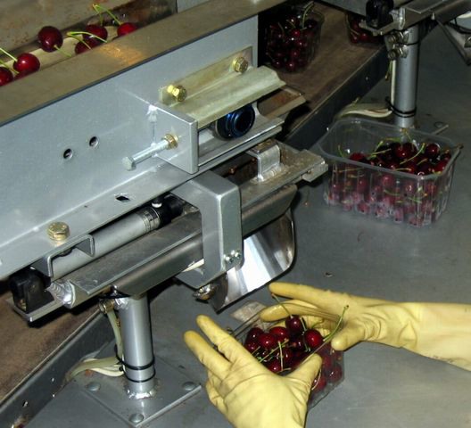 L'operatrice che siede alla fine del nastro, attende il momento in cui esso si fermerà. In quell'istante, la bilancia elettronica avrà calcolato che le ciliegie scaricate dal nastro hanno raggiunto il peso corretto per riempire il cestino.