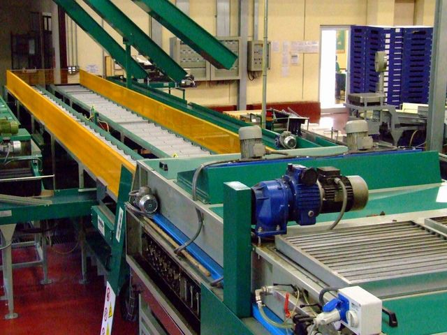 Una bilancia elettronica calcola il peso delle ciliegie contenute in ogni singolo nastro trasportatore.