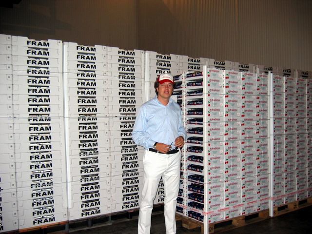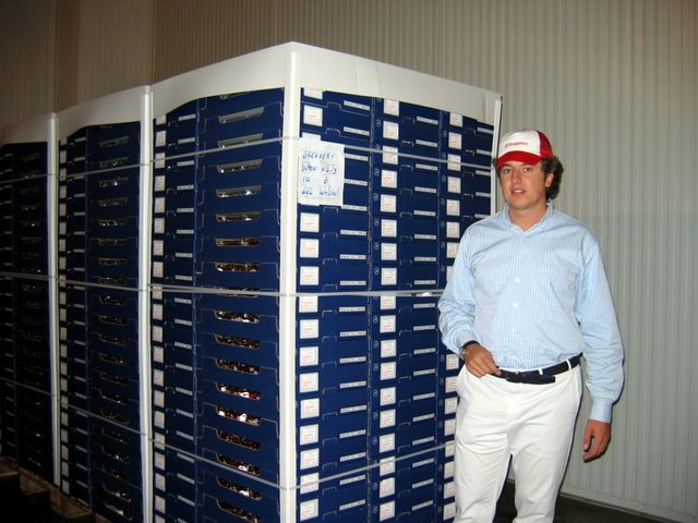 Stefano Pezzo posa accanto ai pallet di ciliegie già confezionate per conto della Greenery.