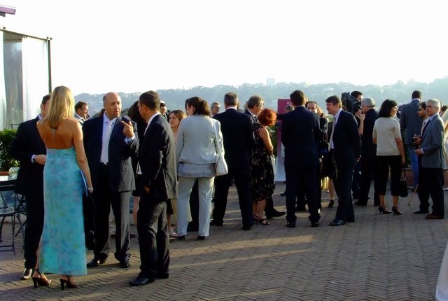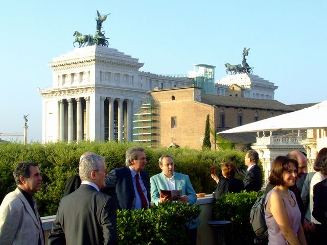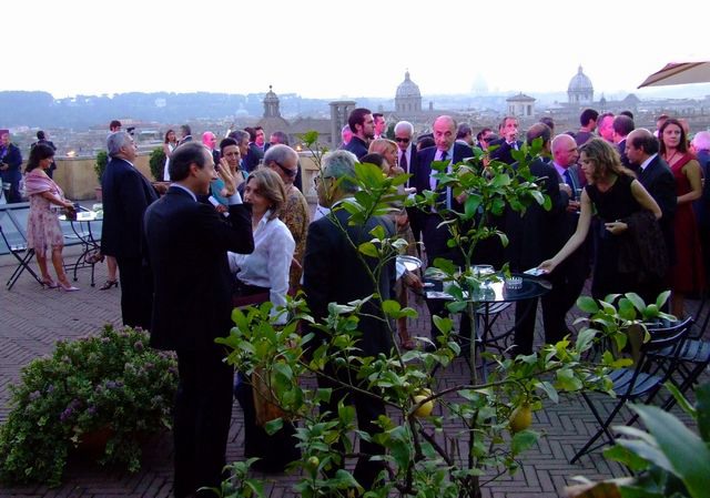 Gli ospiti della conferenza stampa si intrattengono sulla Terrazza Caffarelli.