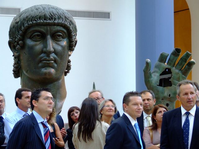 "Dettaglio della visita ai Musei Capitolini, con i resti della statua colossale dell'Imperatore Costantino, che sembra salutare i visitatori. Paolo Bruni dirà poi in conferenza stampa: "Abbiamo scelto di introdurre questa iniziativa editoriale con una visita ai Musei Capitolini, proprio per sottolineare l'importanza delle nostre radici. In un contesto globalizzato, con sfide di mercato sempre più ardue, la chiave della nostra forza è nella valorizzazione delle nostre tradizioni. Il patrimonio di natura e conoscenze può servire come leva competitiva."