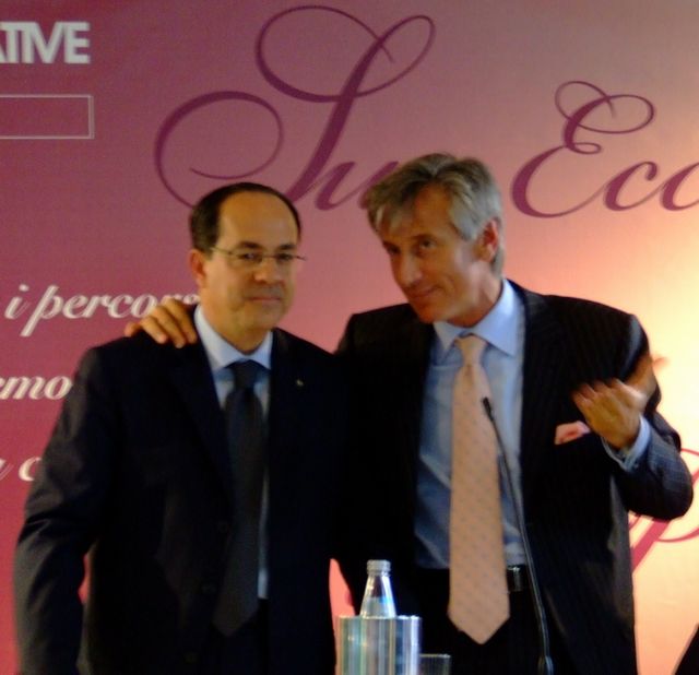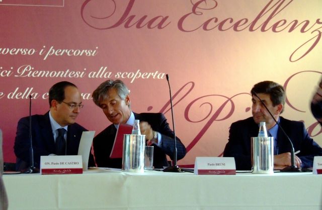 "Alla Tavola Rotonda ha preso parte anche il ministro delle politiche agricole Paolo De Castro, che qui vediamo mentre riceve da Paolo Bruni una copia della guida "Sua Eccellenza il Piemonte"."
