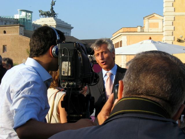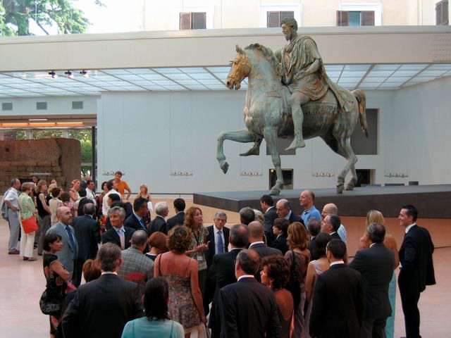 Felice l'abbinamento della conferenza stampa con una visita ai Musei Capitolini. Qui vediamo gli invitati mentre ascoltano con attenzione la guida turistica, sotto la celeberrima statua equestre di Marco Aurelio.