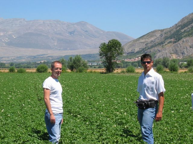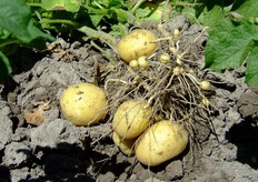 "L'agronomo Paolo Percossi estrae alcune patate dal terreno, per illustrare le caratteristiche di questa varietà: "Agata è una patata precoce, che si presenta esteticamente molto bella e si lava molto bene. La resa può arrivare a 60 ton/ha. E' una varietà che, se conservata, necessita di ambienti refrigerati. Noi tuttavia non la immagazziniamo, ma la vendiamo subito dopo la raccolta. Non è adatta alla cottura. Bassi Ortaggi produce anche patate per l'industria su una superficie di otto ettari. Le varietà da industria sono Lady Claire, Hermes e Agria, tutte dotate di maggior contenuto di materia secca. Ottima la resa della Lady Claire, che sviluppa molti tuberi per ogni pianta, mentre l'Agria si conserva benissimo anche senza bisogno di celle frigo, in quanto non germoglia."