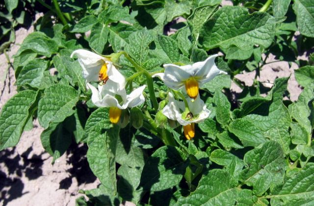 "Dettaglio dell'inflorescenza della pianta di patata. Vincenzo spiega: "Quando poi i fiori e le foglie cadono, ciò significa che è giunto il momento di scavare le patate."