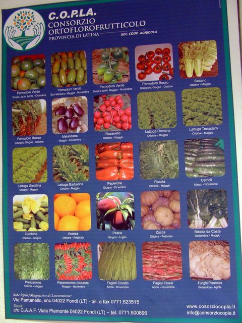 Un manifesto illustra la variegata offerta ortofrutticola del Consorzio, che si avvale dell'opera di 250 soci produttori, il 90% dei quali opera nell'area dei comuni di Fondi, Monte San Biagio e Sperlonga.