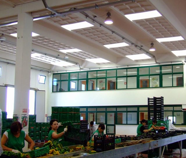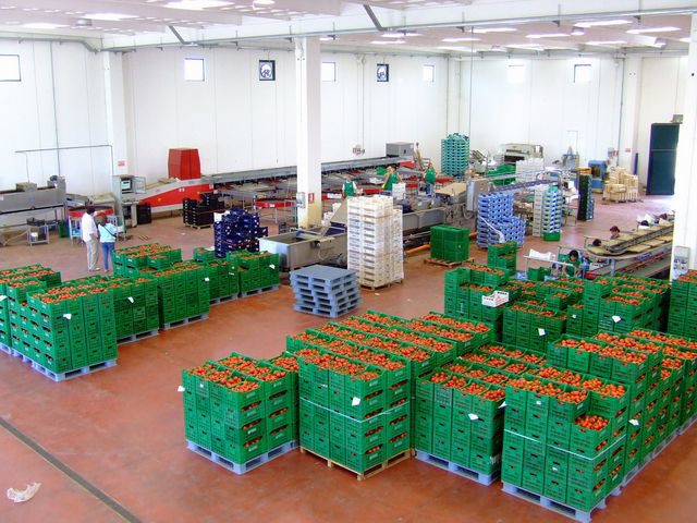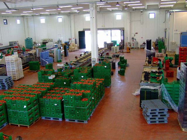 Una vista dall'alto dell'area di lavorazione dei prodotti ortofrutticoli. Lungo la parete di sinistra, la linea di calibratura e selezione per i pomodori verdi; in basso a destra, la linea per il confezionamento dei pomodori a grappolo.
