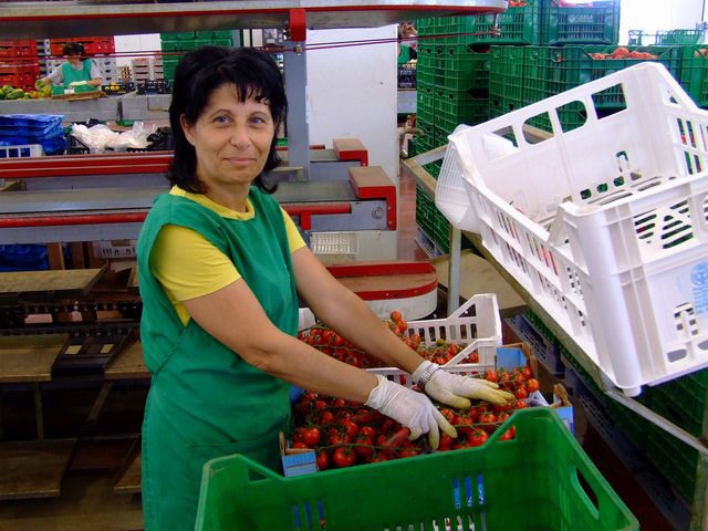 Una delle addette alla lavorazione del ciliegino. Sul suo volto traspare la soddisfazione per i risultati di una mansione svolta con cura.