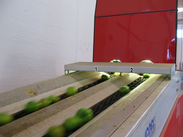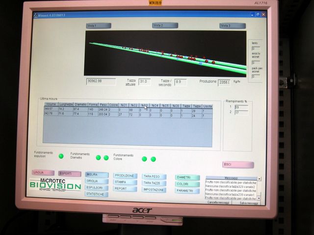 Un software governa il macchinario, che smista i pomodori in base alle impostazioni inserite (calibro + colore). Il macchinario è dotato di 14 uscite.