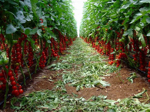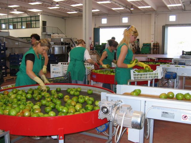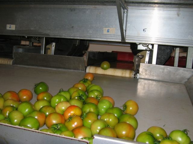 I grappoli di pomodori rossi vengono selezionati a mano, mentre i pomodori verdi passano su una linea di lavorazione automatizzata (si veda più avanti).