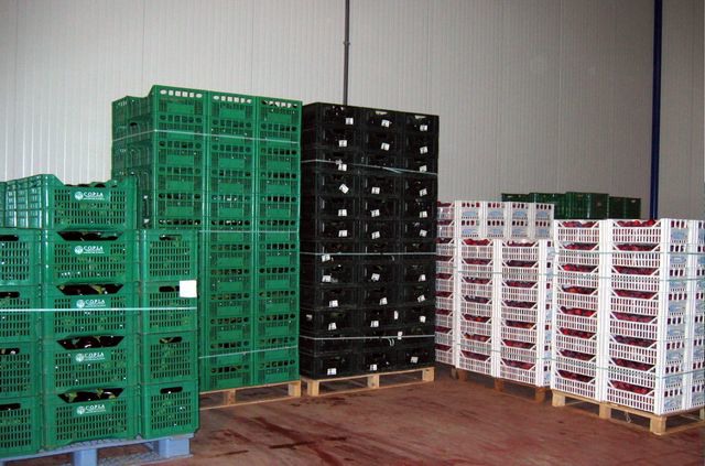 Alcune casse sostano temporaneamente all'interno di una delle tre celle frigorifere a disposizione del magazzino. Qui la permanenza del prodotto, in attesa di confezionamento o di trasporto al centro di commercializzazione, dura solo un giorno.