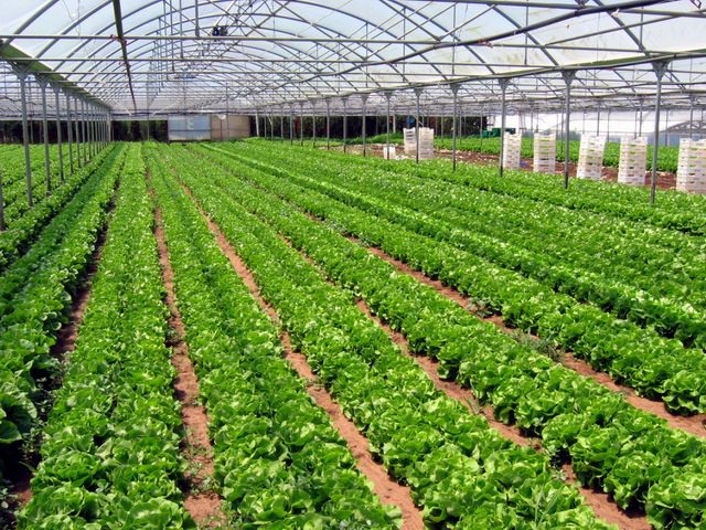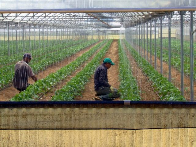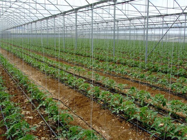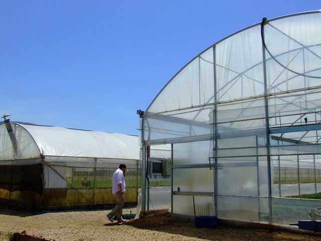 Si noti come recenti investimenti abbiano consentito l'impianto di serre decisamente più alte e capienti delle strutture più datate. La struttura a sinistra è alta solo 2,50 - 3 metri, contro i quasi 6 della serra a destra.