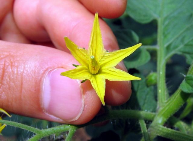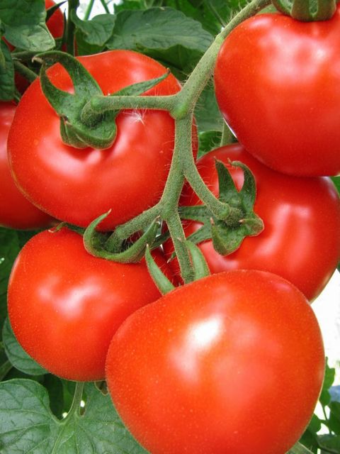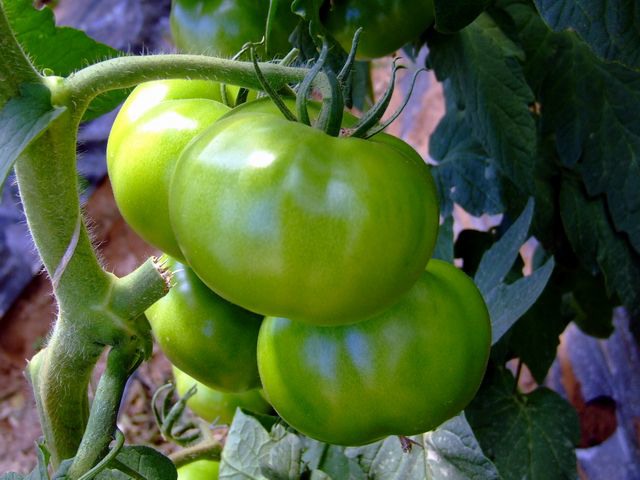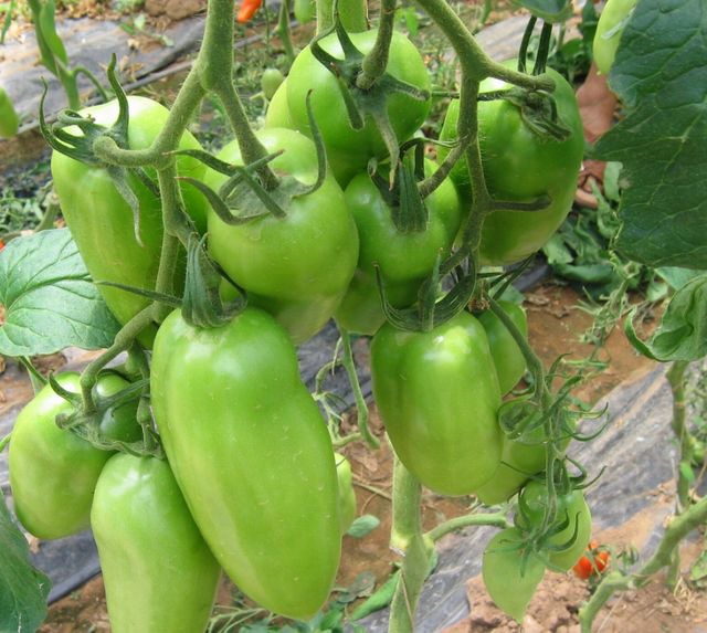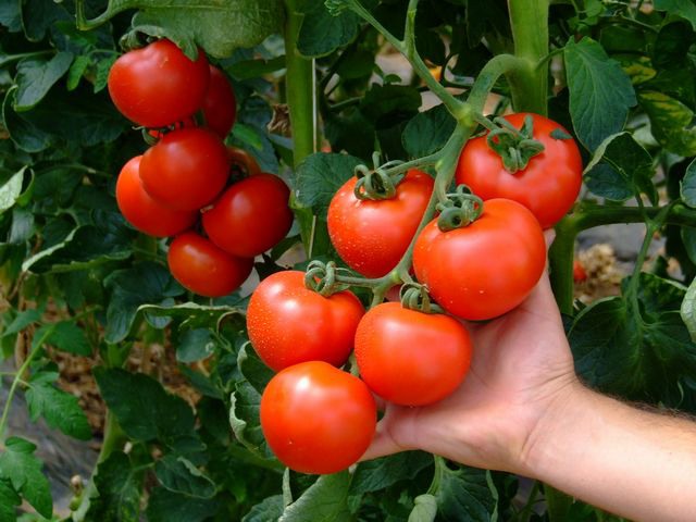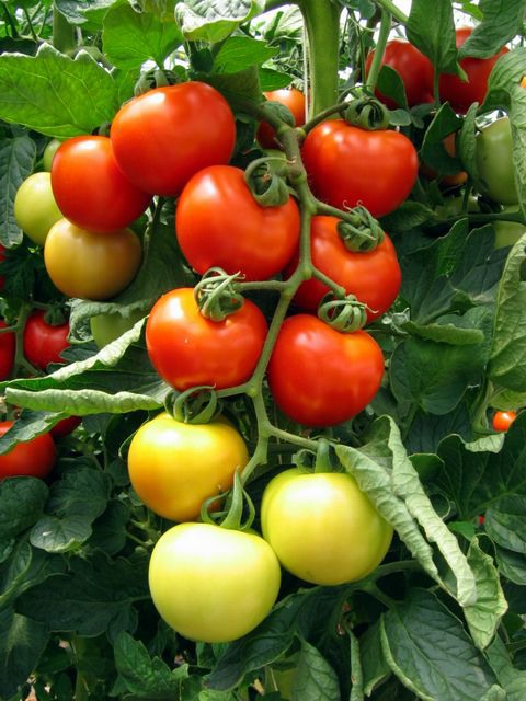 Questa immagine mostra molto bene il processo di maturazione nelle piante di pomodoro. I grappoli maturano dal basso verso l'alto sulla pianta e dalla radice alla punta nel singolo grappolo. La raccolta viene dunque eseguita in diversi passaggi, eventualmente eliminando i frutticini in punta al grappolo, che risultassero meno maturi.