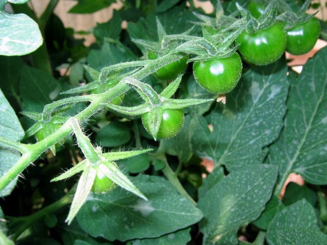 I grappoli di ciliegino sembrano collane di corallo che spiccano tra le foglie verdi.