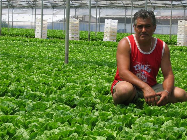 Un ritratto del produttore, Pasquale D'Arcangelo. Il periodo della produzione delle insalate va da settembre fino a maggio.