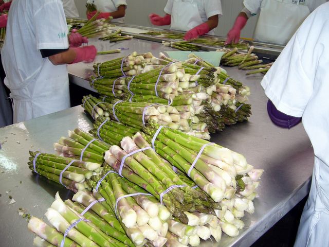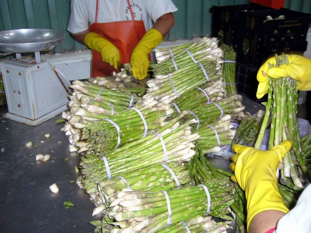 "Gli ultimi "ritocchi" ai mazzi di asparagi, prima del confezionamento."