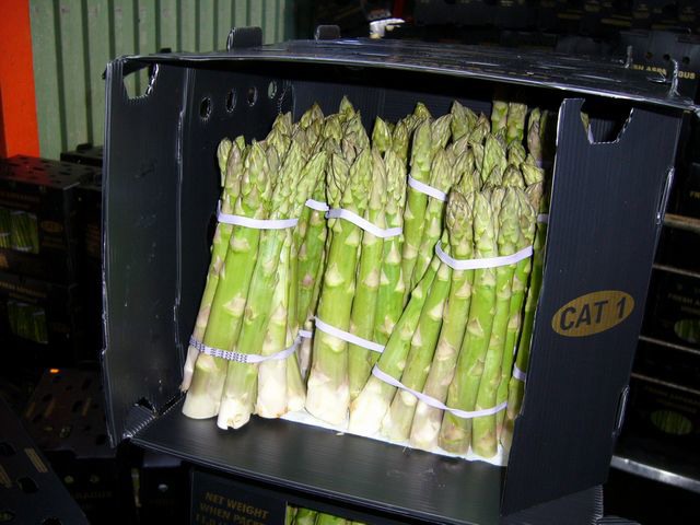 Asparagi verdi di I categoria, confezionati in casse e pronti per la spedizione.