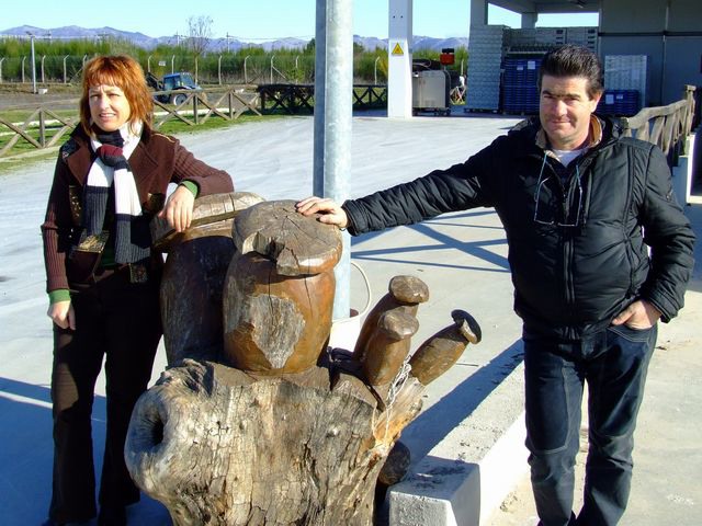 Maria Gentili e Enzo Porretta ci accolgono per una visita agli stabilimenti. Si noti la scultura di legno a forma di fungo.