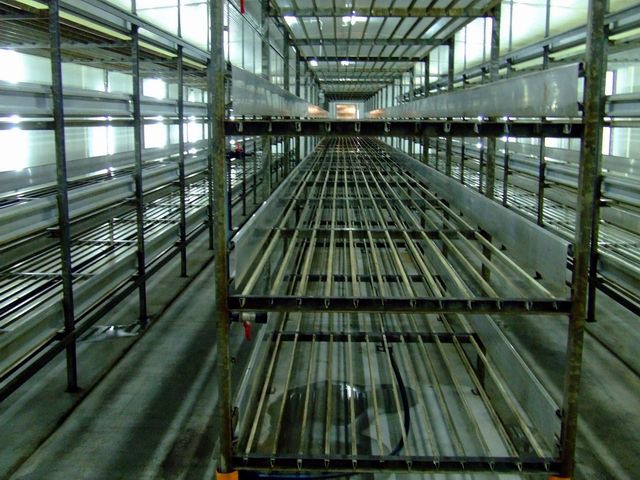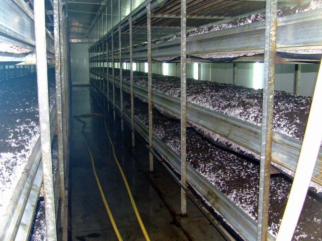 "La moderna produzione di funghi non utilizza più ambienti naturali, come le grotte, ma celle a temperatura e umidità controllata, che forniscono un habitat perfetto per lo sviluppo di funghi. Qui vediamo i "letti" di metallo, pronti ad accogliere il substrato sul quale i funghi verranno coltivati."