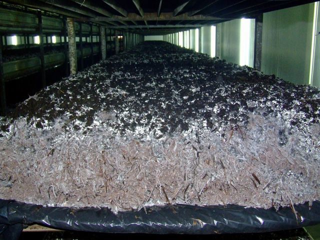 "Ecco il "substrato" per la produzione dei funghi: si tratta di un composto di paglia sterilizzata, ricoperto da un sottile strato di terriccio, sul quale viene inoculato il micelio, da cui prenderanno forma i funghi."