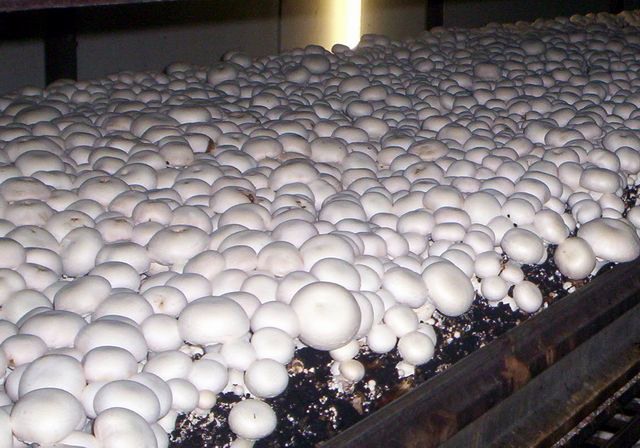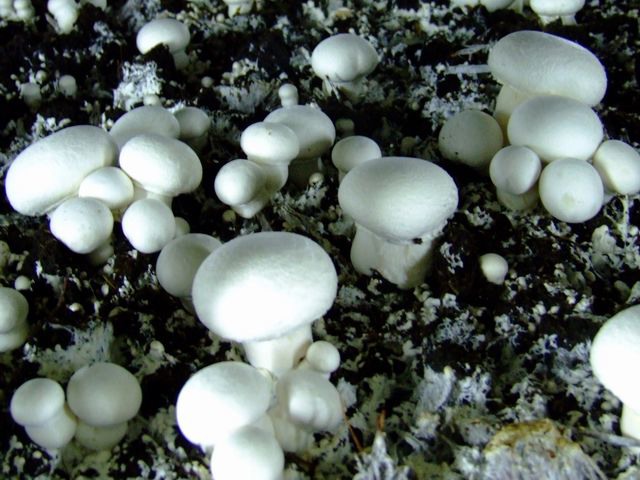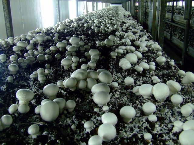 Come si nota in questa fotografia, i funghi si trovano in diverse fasi di crescita. Questo è un effetto volutamente ottenuto, attraverso studiate variazioni di temperatura nelle stanze di produzione, in modo che il prodotto non sia pronto tutto insieme, ma possa essere raccolto in diversi passaggi.