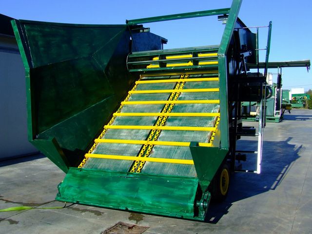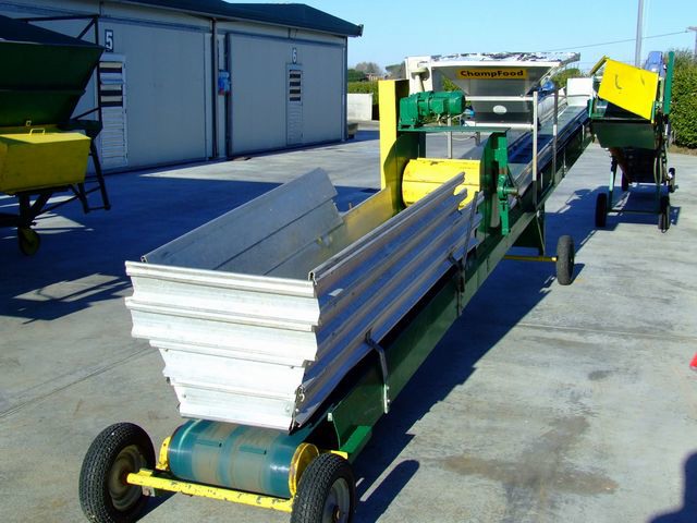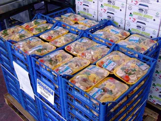 Momentaneamente posteggiato tra i pallets, vediamo un nuovo macchinario che l'Azienda utilizzerà per meccanizzare la fase di smistamento del prodotto tagliato nelle vaschette, con sveltimento dei tempi di confezionamento e maggiore precisione nel contenuto netto di prodotto in vaschetta.