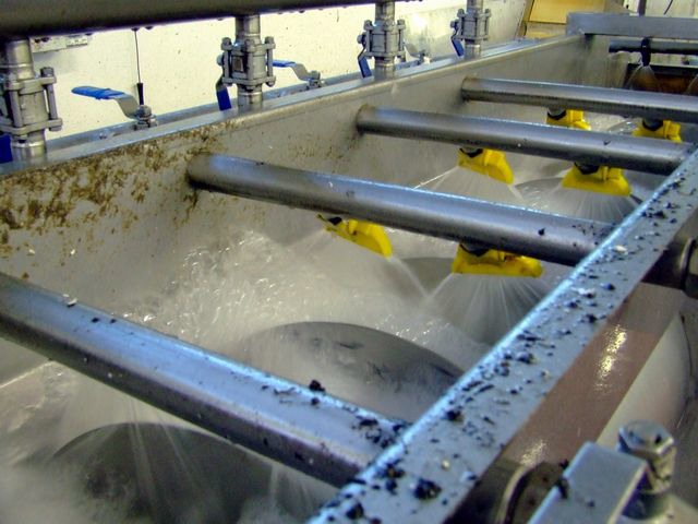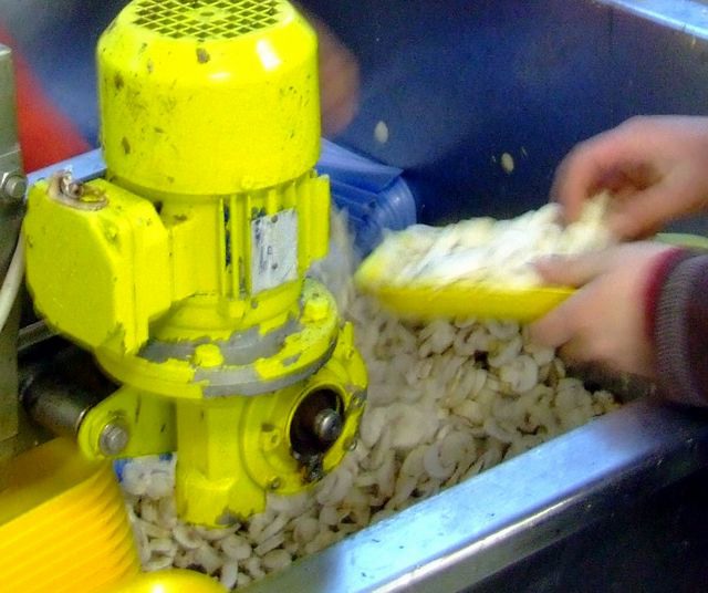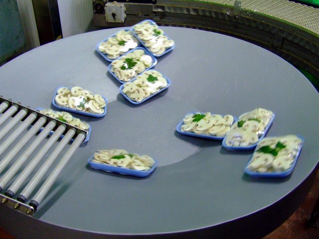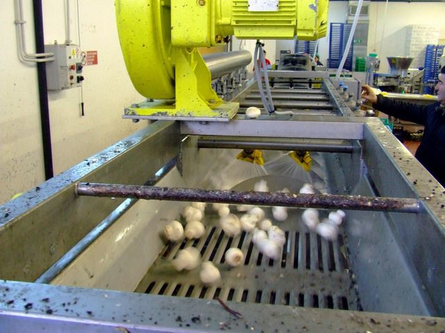 Alla fine del processo di lavaggio, i funghi vengono asciugati da una ventola e passano infine attraverso una fila di lame, che li taglia in fette.