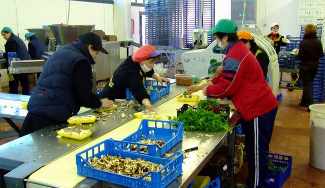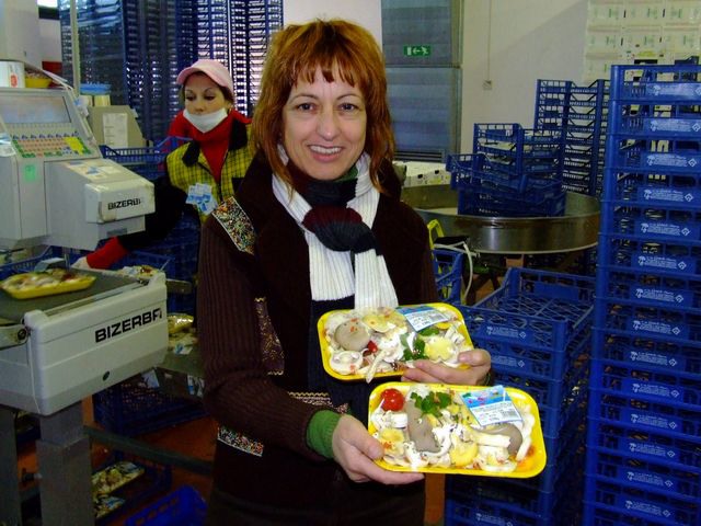 Le operatrici di questo bancone sono intente nel preparare uno dei prodotti dell'Azienda Gentili Maria più richiesti dal mercato: la vaschetta di funghi tagliati trifolati.