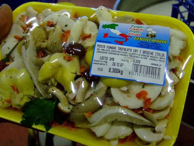 "Un misto funghi, altro prodotto "artigianale" proposto dall'Azienda Gentili Maria. Alcune vaschette sono arricchite con un peperoncino, altre con un pomodoro ciliegino."