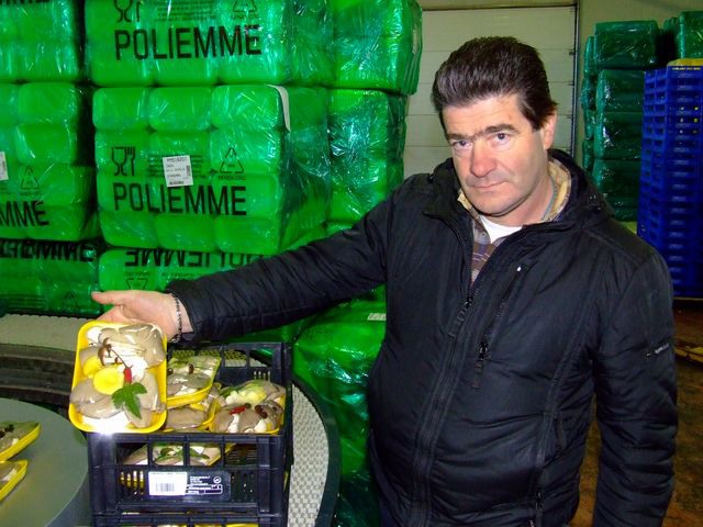 Enzo Porretta mostra un vassoio di funghi misti. Le vaschette che non recano l'etichetta dell'Azienda sono destinate alle private label (per esempio i marchi della grande distribuzione) o ad altri commercianti che apporranno il proprio brand sulle confezioni.