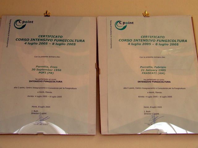 Attestati del corso olandese di fungicoltura frequentato da Enzo Porretta.