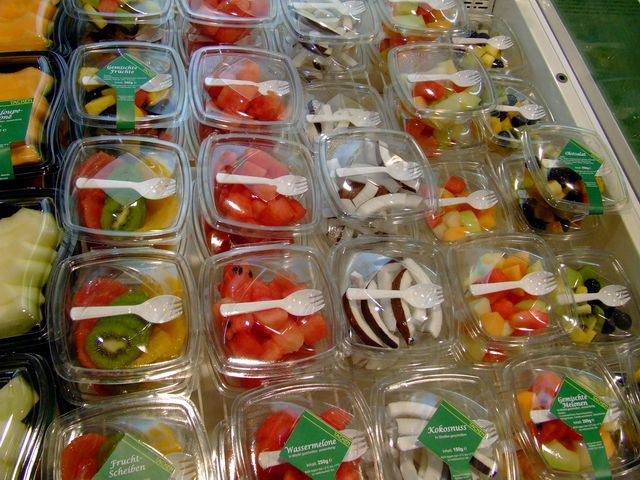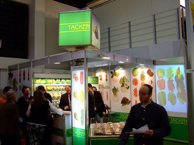 Vaschette di frutta già dotate di forchetta preso lo stand della Tacken GmbH & Co.
