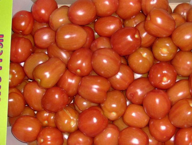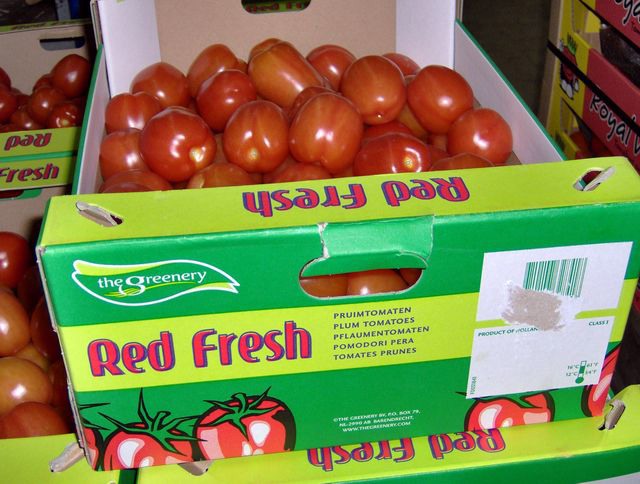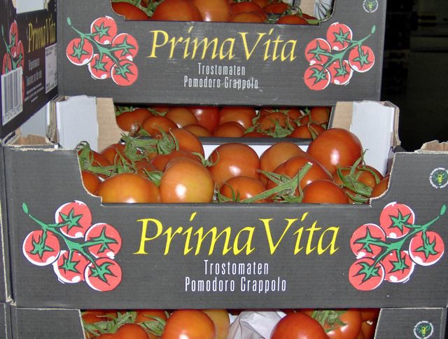 "Pomodoro a grappolo olandese. Si noti il marchio "Prima Vita": i nomi che suonano italiani vengono considerati molto efficaci dal punto di vista commerciale."