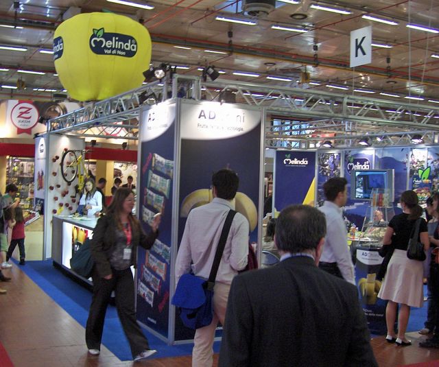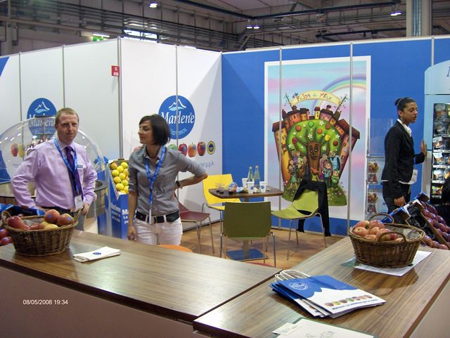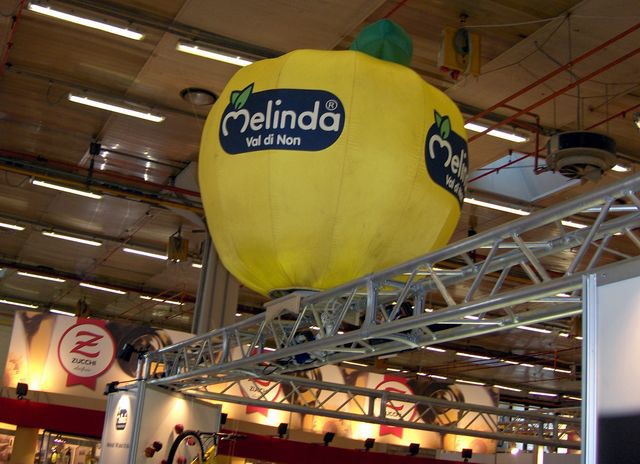 Un'enorme mela gonfiabile sovrasta lo stand Melinda