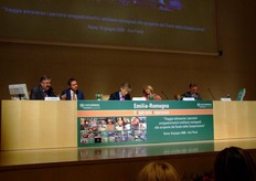Ha avvio la conferenza stampa. Da sinistra a destra: Giovanni Bettini (presidente di Fedagri-Confcooperative Emilia Romagna), Adolfo Urso (sottosegretario allo Sviluppo Economico), Paolo Bruni (presidente di Fedagri-Confcooperative), Myrta Merlino (giornalista Rai e conduttrice di Economix) e Tiberio Rabboni (assessore all’Agricoltura dell’Emilia Romagna).