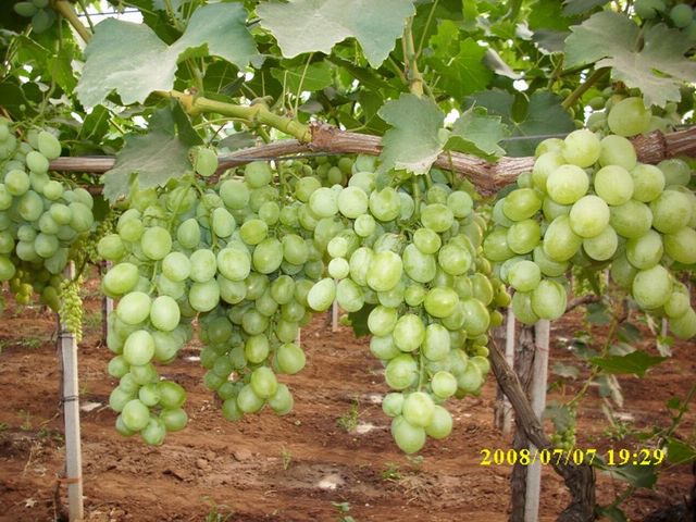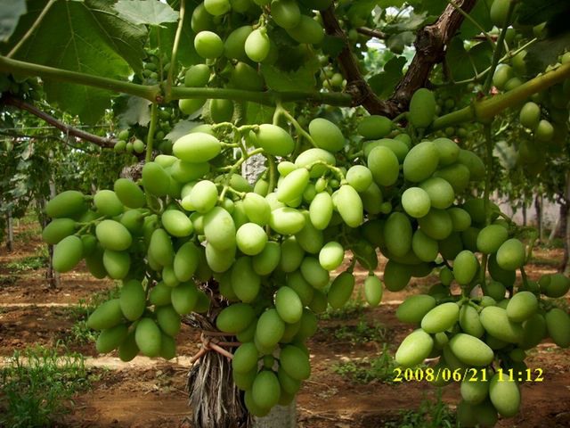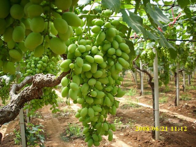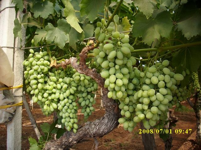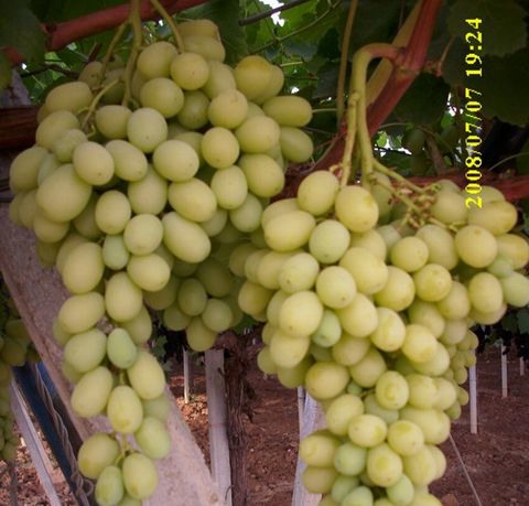 "L'azienda Clarabella di Antonio Bernardi, sita a Palagiano (TA), e' specializzata nella produzione di uve con seme e senza seme. Qui vediamo un grappolo di uva bianca Vittoria, nella fase precedente alle operazioni di "acinellatura", cioe' della eliminazione manuale degli acini troppo piccoli o non ben formati."