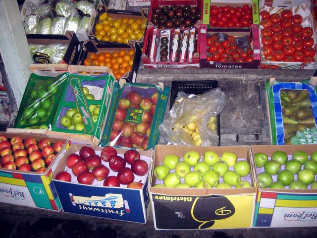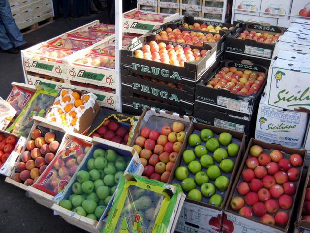 Banco con frutta, agrumi e ortaggi di diverse origini.