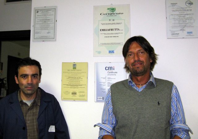 Insieme al responsabile qualita' Stefano Vignoli (sulla sinistra), il direttore Luca Gentilini mostra le varie certificazioni ottenute dallo stabilimento.