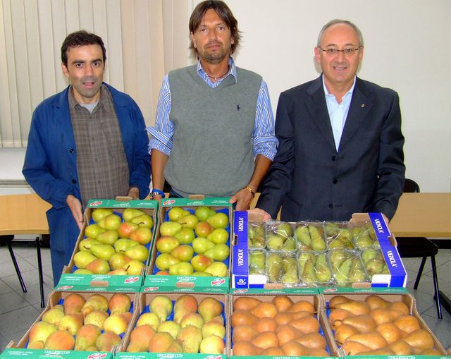 Stefano Vignoli, Luca Gentilini e Diego De Lucca mostrano alcune confezioni delle principali varieta' di pere prodotte nella zona vocata del modenese.