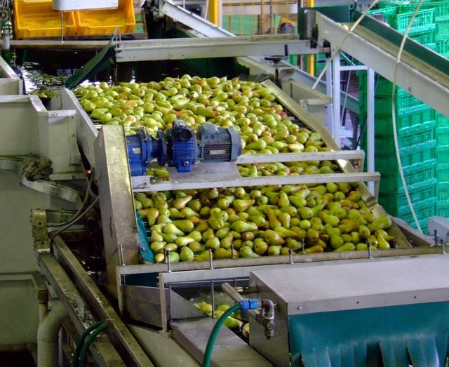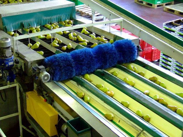 Prima fase. Le pere vengono lavate e inviate alla calibratrice.