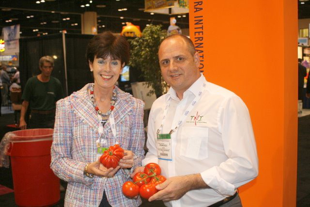 L'ambasciatrice olandese in USA mostra alcuni pomodori proposti presso uno stand allestito da un'azienda olandese.