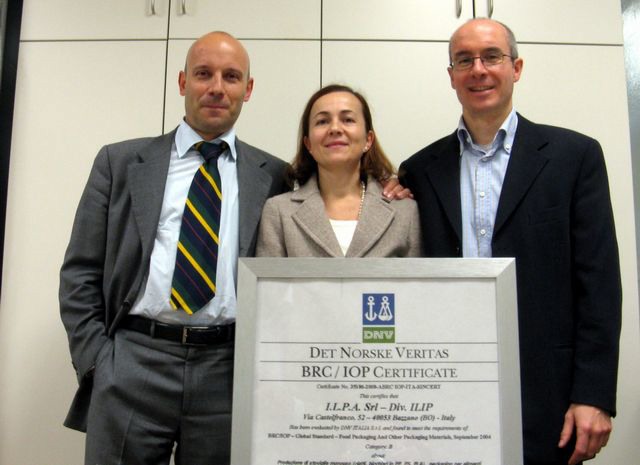 Mauro Stipa, Roberta Donati e Michele Bertoli in posa insieme alla certificazione BRC ottenuta dall'azienda, la quale si e' anche adeguata al sistema informatico gestionale SAP.