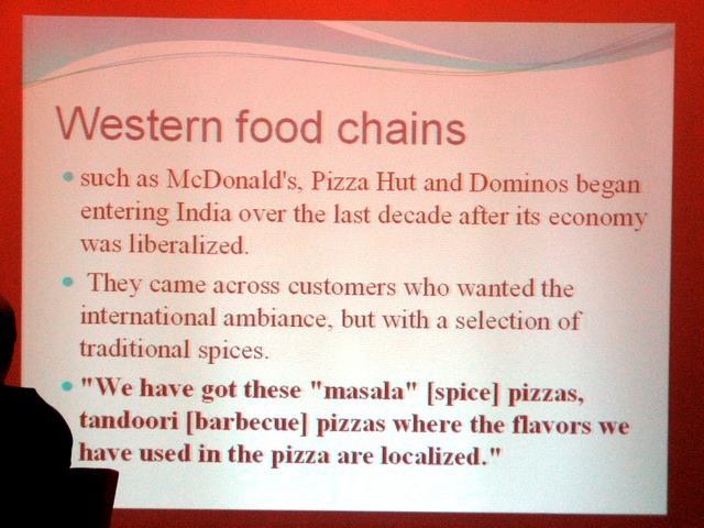"Grandi catene della ristorazione occidentale come McDonald's, Pizza Hut e Dominos hanno fatto il loro ingresso sul mercato indiano nel corso degli ultimi anni, approfittando della liberalizzazione dell'economia. Queste compagnie hanno saputo intercettare la domanda dei consumatori verso uno stile di vita piu' "occidentale", arricchendolo pero' con le usanze gastronomiche locali. Sono nate cosi' nuove proposte alimentari come le pizze speziate o "barbecue", per incontrare il gusto dei consumatori indiani."